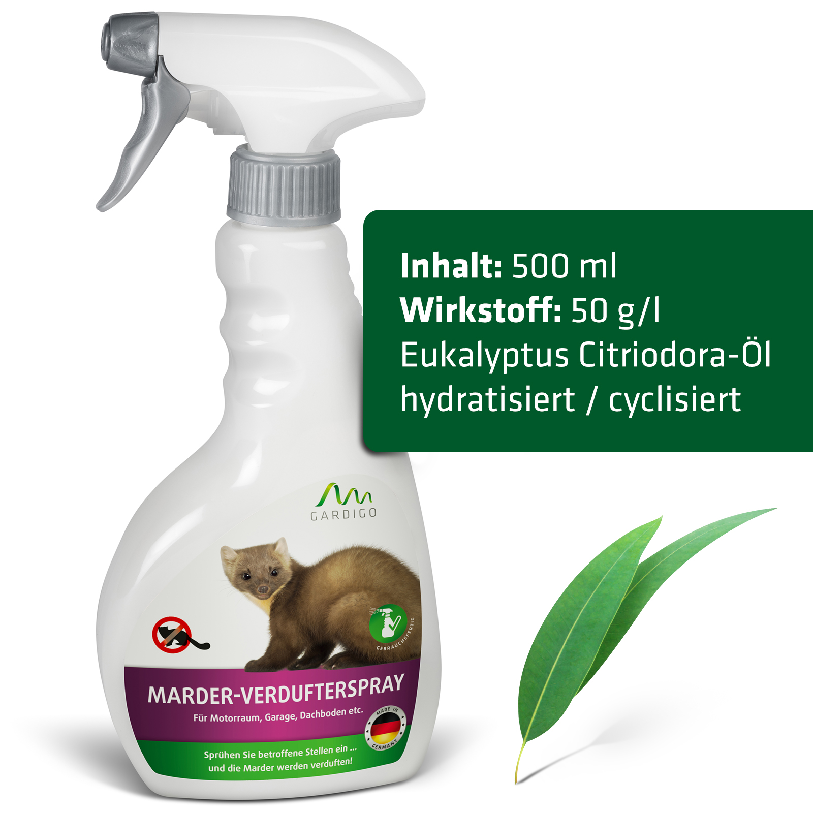 Info sui prodotti "Marderspray mit Eukalyptus citriodora Öl | Vergrämungsmittel gegen Marder | Verdufter-Spray"