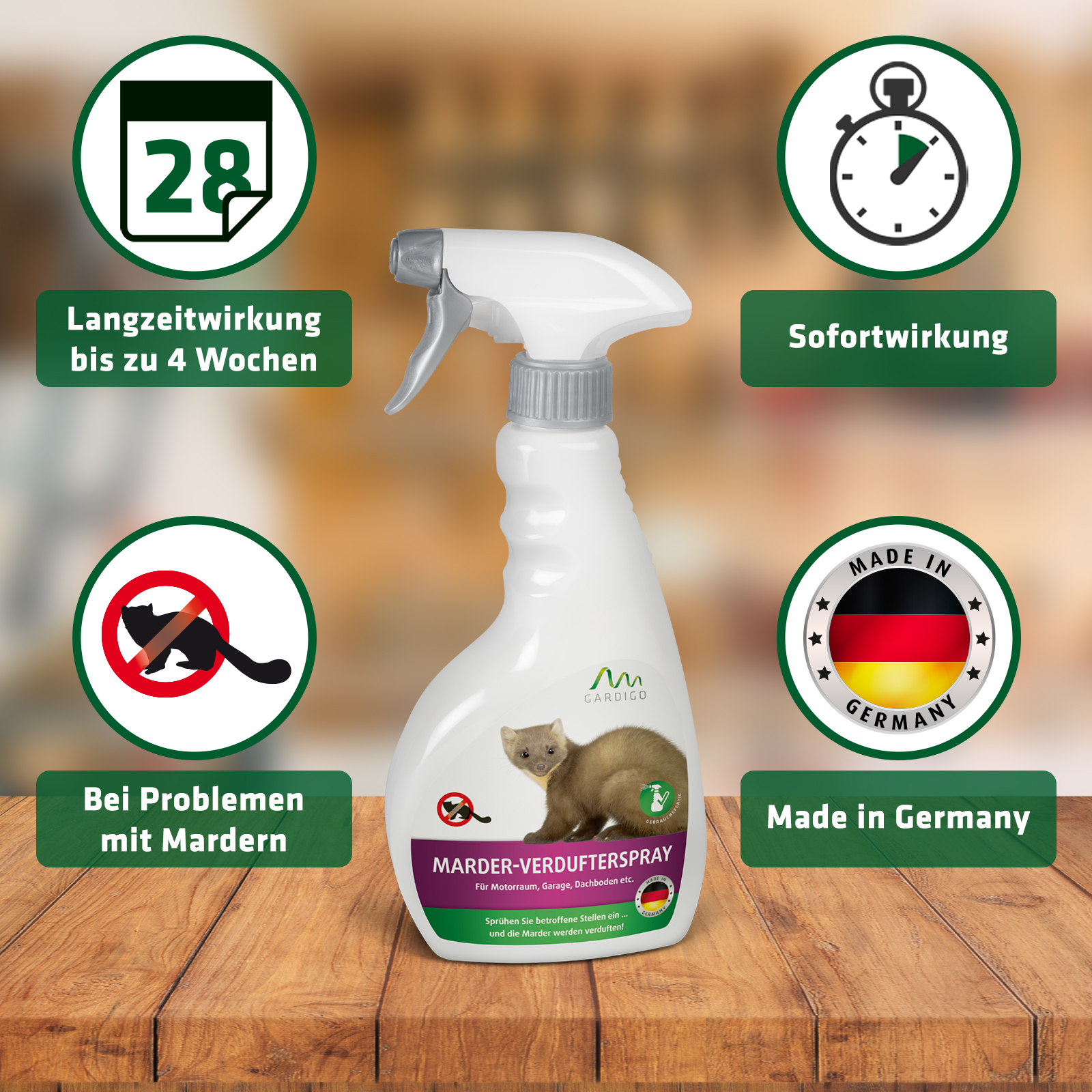 Das Marderspray von Gardigo ist ein Mittel zum Fernhalten und Vertreiben bzw. Vergrämen von Mardern.